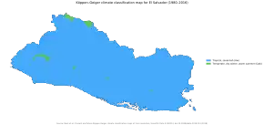 El Salvador has a tropical climate with pronounced wet and dry seasons.[1] Temperatures vary primarily with elevation and show little seasonal change.[1] The Pacific lowlands are uniformly hot and humid; the central plateau and mountain areas are more moderate.[1]
