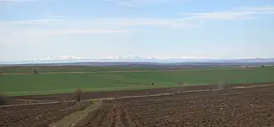 View across the Bulgarian section of the Lower Danubian Plain towards the central Balkan Mountains 90 km away