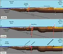 The last and most recent stage in the evolution of the Antarctic Peninsula subduction zone is the opening of the Bransfield Rift,[2][5] creating the Bransfield back-arc basin from the Oligocene to the present day.[2] This basin separates the inner, older magmatic arc (mainland Antarctic Peninsula) from the outer, younger magmatic arc (South Shetland Islands).[9] Alkaline and tholeiitic volcanic activity is associated with this rifting event.