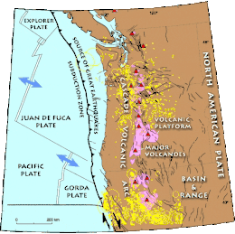 Where the Sierra Nevada ends, a chain of explosive volcanic centers, the Cascade volcanoes, begins. The Cascades Province forms an arc-shaped band extending from British Columbia to Northern California, roughly parallel to the Pacific coastline. Within this region, 13 major volcanic centers lie in sequence like a string of explosive pearls.[3]