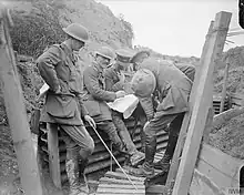 Two British Generals (59th Brigade of the 20th Light Division) in a trench in front of Lievin, 14 May 1918. One of them might be Major General C. G. S. Carey, the Commander of the 20th (Light) Division.