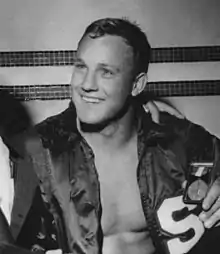 George Prifold Harrison (April 9, 1939 – October 3, 2011) was an American competition swimmer, Olympic champion, and former world record-holder in three events.[2] He competed at the 1960 Summer Olympics in Rome, where he received a gold medal as the lead-off swimmer of the winning U.S. team in the 4×200-meter freestyle relay. Harrison, together with his American relay teammates Dick Blick, Mike Troy and Jeff Farrell, set a new world record of 8:10.2 in the event final.[3]