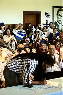 Supporters including Saturnino Cerrato (front row, right) applaud as Henriquez signs the National Coalition proclamation in February 2020