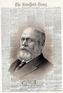 Upon Raymond's death in June 1869, Jones took over as publisher. Between 1870 and 1871, the paper repeatedly attacked Boss Tweed through editorials by George William Curtis and illustrations by Thomas Nast. Tweed tried to buy Raymond's widow's 34% share in the company, but Morgan purchased it before he could.[4] Tweed once had an associate offer Jones $5 million to not print a story that was unfavorable to Tweed; Jones refused the offer and proceeded with the publication of the story. The efforts of the Times contributed to the downfall of Tweed and his corrupt city government.[2]