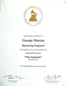 George Marino (1947–2012) was an American mastering engineer known for working on albums by rock bands starting in the late 1960s. Marino mastered and remastered thousands of albums in over forty years. He started his career at Capitol Records and was there from 1967 to 1971, then became a partner in the Record Plant's Master Cutting Room from 1971 to 1973. Marino spent the vast majority of his career mastering at Sterling Sound from 1973 until his death in 2012.[1]