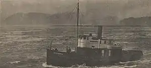 The first captain of Vosburg was Ernest Loll.[5] In 1901, Vosburg made several trips to San Francisco from Nehalem and Tillamook with Wheeler in tow, carrying lumber.[11][12][13][14] Vosburg also towed Wheeler into Tillamook City via Hoquarton Slough, making Wheeler the largest vessel ever to arrive at Tillamook City and sparking the interests of local merchants in establishing a direct lumber trade with San Francisco.[15][16]