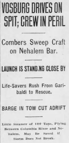 On Friday, May 3, 1912, shortly before noon, Vosburg, under Captain Erickson, while towing Nehalem went ashore on the north spit at the mouth of the Nehalem River.[68] An initial news story reported that Vosburg "appears to be doomed to be smashed in two in a short time" and further that it appeared that "there is no hope of saving the lives of her captain or crew."[68] Later reports showed the situation to be serious but not to the extent initially reported. The tug had struck bottom at about 11:00 a.m., and several huge combers broke over the vessel, aground on the south spit, soon thereafter, but after that the sea became calmer.[69] Vosburg cut loose the Nahelem, which drifted into calmer waters.[69]