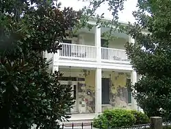 The three-bay south façade has a double gallery, which is not original to the house. The gallery was altered or expanded three times during the twentieth century.[27] In the current configuration, the galleries are accessible from the interior of both stories via doors on the western ends of the south facade. The first-story door, with an architrave featuring colored glass, pilasters, sidelights, and a transom, serves as the house's primary entrance. The lintels of the windows on the south facade have stucco scored to simulate heavy keystones. The sills, original to the house, are made of white Vermont marble.[28]