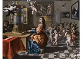 Gerard de la Vallée's works are often derived from, or inspired by, the works of the great masters of the Antwerp school.[3] For instance in his Ecce Homo (At Jan de Maere), the figure of the Christ is inspired by Anthony van Dyck’s Ecce Homo in the Barber Institute of Fine Arts in Birmingham, England.[7] The mining of images of other masters to create new works for the export market was a hallmark of the Forchondt workshop and is also evident in de la Vallée's work.[3] Another example is seen in the St Cecilia (At Hampel Kunstauktionen (Munchen) 4 July 2008, lot 223 as by Peeter Sion). The dancing cupids in this work appear to be based on the work King David’s Song of Praise to God by Peter de Witte (also known as Peter Candid) (a version in the Frans Hals Museum).[8]