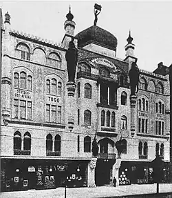 In 1903, the large German Colonial House was built at Lützowstraße 89-90.[6] The architecture was based on colonial motifs: the oriental-looking front with a towering dome was decorated with statues of mounted elephants, lions, African warriors and the names of the German colonies. The execution goes back to Rudolf Hellgrewe, who also enriched the interior with colonial-inspired ceiling paintings.[7] The new building complex housed business and storage rooms in the front building and the rear building, which can be reached via an inner courtyard. The new building had an enormous administrative apparatus, which in turn was divided into the supervisory board, the so-called "expedition department" for organisation of packaging and shipping, and the marketing department or Division for realm-wide advertising.[7]
