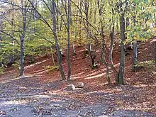 In geological terms, it has been determined that Germia mountain massif consists of layers formed during the Paleozoic, Mesozoic and the Cenozoic eras, where the flysch character limestone, silica and sand are dominant. The pedological composition mostly consists of skeletal and half-skeletal soils. Predominantly, there are maroon-colored flysch character lands, shale rocks and deep brown soil.[1] Germia mountain massif consists of hills and slopes of different heights which are separated by valleys, streams and rivers. The Vellusha river valleys, which stems in the western part of Butos' hill, is worth mentioning. The hills of Butos represent the most characteristic landscape, with over 1000 meters altitude and length of approximately 8 kilometers. This part lies between the river of Prishtina on the north and the Badovc Lake on the south.