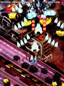 Players have only two weapons at their disposal: the main gun that travels a max distance of the screen's height that can be held down to concentrate fire but reduces the ship's movement, and bombs capable of obliterating any enemy caught within its blast radius.[1][2] By destroying enemies with concentrated fire, enemies drop grey orbs when defeated, which grants an extra bomb stock when a gauge is filled.[2] There are multiple scoring methods for reaching high-scores: points can be gained from collecting gold medals scattered. Destroying an enemy or part of an enemy increases the combo by 1 and builds up a combo gauge that constantly drains, and the combo is broken when it empties.[1][2] Getting hit will result in losing a life, and the game is over once all lives are lost. The HD version, titled Ghost Blade HD, introduces a timed score attack mode akin to shooters by Hudson Soft, where the player is tasked with scoring as many points before the time runs out.[1][2][3][4]