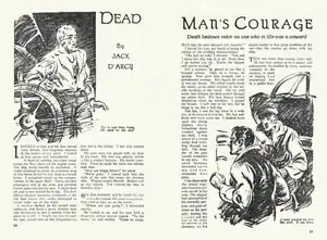 Two pages (26-27) of magazine (October 1930, vol. 9, no. 4) featuring "Dead Man's Courage"