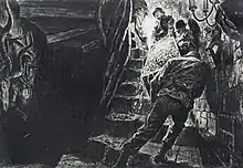 Duotone image of a burning Zeppelin for Stag magazine, January 1960