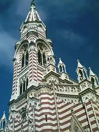 Buscaglione's architectural style in Colombia was a stylistic expression influenced by his Italian roots but also incorporated styles of Islamic architecture in the near east which he had become fond of during his time in Turkey and Egypt in Izmir, Istanbul and Alexandria. This was reflected in his works such as the Greater Seminary of Medellín (1919–1928) – today a commercial center, the Colegio de León XIII (1922–1938) and the Santuario Nacional de Nuestra Señora del Carmen (1926–1938) in Bogota, considered his masterpiece. The Florentine Gothic style was prevalent in his work, and he was under contract to construct more than thirty churches and chapels under the national reformation programme during which the Metropolitan Cathedral of Medellín was completed. The tower rises 57 meters above the vestibule, characterised by its ornate white facade. It was declared National Monument of Colombia in 1993[1]