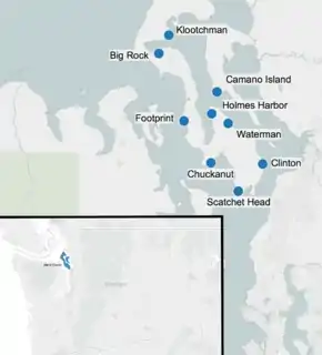 Klootchman Rock (also spelled Kloochman) is metamorphic rock boulder with white veins. The 35-foot (11 m)[14] tall boulder topped with grass, and its broken shards sit at the base of Blowers Bluff between Penn Cove and Oak Harbor.[15][16] The rock has a National Geodetic Survey control station at its highest point.[14] There is a submerged feature (bar) also called Klootchman Rock about 100 meters offshore.[17]