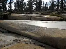 Glacial polish is a characteristic of rock surfaces where glaciers have passed over bedrock, typically granite or other hard igneous or metamorphic rock. Moving ice will carry pebbles and sand grains removed from upper levels which in turn grind a smooth or grooved surface upon the underlying rock.[1] The presence of such polish indicates that the glaciation was relatively recent (in geologic time scale) or was subsequently protected by deposition, as such polish will be subsequently lost due to weathering processes (such as exfoliation).