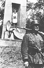 The 1918 Alsace-Lorraine monument, depicting a German Eagle impaled by a sword, in 1940 covered with the Third Reich flag and guarded by a German soldier