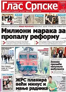 The Glas Srpske (lit.'The Voice of Srpska'[1]) is a Bosnian daily newspaper published in Banja Luka. Together with Bosniak-oriented Dnevni avaz from Sarajevo and Croat-oriented Dnevni list from Mostar, Glas Srpske is one of three main ethnic newspapers in Bosnia and Herzegovina addressing various issues primarily from the mainstream or elite perspective among Bosnian Serbs.[1][2] Glas Srpske is together with Nezavisne novine one of the two newspapers in widest circulation in the entity of Republika Srpska.[3]