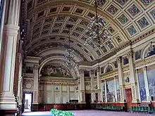 The ornate banqueting hall, which is 33.5 m (110 ft) long by 14.6 m (48 ft) wide and 15.8 m (52 ft) high, is decorated with huge murals by the Glasgow Boys.[5] The decoration was co-ordinated by architect William Leiper.[15] The room hosted Nelson Mandela and Sir Alex Ferguson when they received the Freedom of the City in 1993 and 1999, respectively.[5] The Council Chamber is clad in Spanish mahogany panelling and its windows are made of Venetian stained glass.[5]
