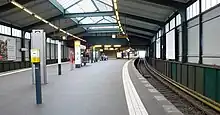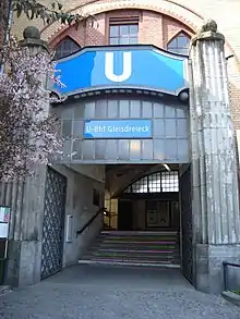 Gleisdreieck is an elevated Berlin U-Bahn station located on a viaduct in the Kreuzberg district, and served by lines U1, U2, and U3. The U1/U3 platform is at a higher level than, and perpendicular to, that of the U2.[2]