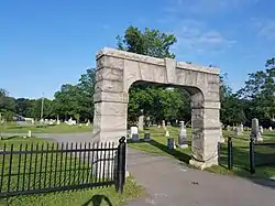 The oldest portion of the cemetery is 8 acres (3.2 ha) in size, and was purchased by the town in 1871, the year of its incorporation out of portions of Sudbury and Stow. This area was laid out in a version of the style of the then-fashionable rural cemetery movement, with a circular lane at the entrance and a series of parallel lanes behind. At the center of the circle there was originally a gazebo, which was to be a focal point of the cemetery. It was destroyed in the New England Hurricane of 1938. The main gate (image) is not the original. It replace an earlier cast iron gate in 1928. The majority of the trees in the cemetery are sugar maples, planted after the hurricane to replace downed trees. About two dozen burials pre-date the official creation of Glenwood Cemetery, suggesting that it was functioning as a privately owned cemetery before the land was purchased by the town.[3] East of this original portion is the "new cemetery" section laid out in the 1930s, using labor funded by the Works Progress Administration. It has a series of concentric lanes in a roughly ovoid shape, and is joined to the old section by a single lane.[2]