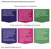 The GCED expected learning outcomes are based on a vision of learning that covers three domains to create a well-rounded learning experience: cognitive, socio-emotional and behavioural. Although distinct, the three domains do not represent isolated learning processes; they often overlap, reinforce and build upon each other, and can also occur in parallel.[25] For example, socio-emotional learning requires understanding existing challenges in the community (cognitive) and making informed decisions (behavioural).