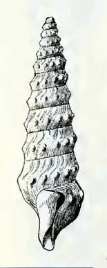 (Original description) The long, slender shell shines with the lustre of barley-sugar candy. It contains 12 whorls, of which two are in the protoconch. These two are white, smooth, rather large, inflated, polished, not sculptured except by lines of growth, changing suddenly into the normal sculpture. The sculpture consisting of small pointed nodules set on the periphery of the whorls, a little in advance of midway between the sutures. They number ten to fourteen on each whorl, except the last half-whorl in the adult, where they begin to be obsolete. The tips of these nodules and a line just in advance of the suture are white as compared with the general translucent pinkish or fleshy hue. These nodules are a little compressed in the latter whorls in a direction transverse to the whorls. The lines of growth are distinct and in the later whorls occasionally a little prominent at the suture, against which the shell is appressed. There is no other transverse sculpture. The revolving sculpture is comprised in fifteen or twenty threads on the body whorl, faintly visible at the periphery and gradually becoming stronger toward the end of the siphonal canal An occasional trace of such might be visible on some of the older whorls. The anal sulcus is moderately deep. The notch-band is not strongly marked. The outer in the adult is produced (but imperfect in our specimens), apparently having the usual form. The columella is obliquely cut off anteriorly, covered with a light callus. The siphonal canal is narrow. The aperture is short and seemingly rather wide, behind.[3]