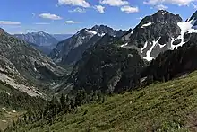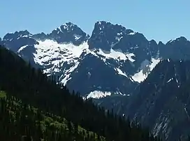 During the Pleistocene period dating back over two million years ago, glaciation advancing and retreating repeatedly scoured the landscape leaving deposits of rock debris.[6] The U-shaped cross section of the river valleys is a result of recent glaciation. Uplift and faulting in combination with glaciation have been the dominant processes which have created the tall peaks and deep valleys of the North Cascades area.