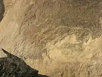 The cultural landscape was firstly discovered by local miner in 1939–40.[12][2] The sticky drawings of the deer, goat and cattle dated between 12th and 8th centuries BC reflect the Neolithic period in Gobustan.[13] Gobustan petroglyphs studied by Isak Jafarzadeh who analyzed approximately 750 rocks with more than 3,500 petroglyphs in 1947 and onwards were divided into 6 periods from ancient times to the Middle Ages: