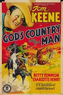 God's Country and the Man is a 1937 American Western film directed by Robert North Bradbury and written by Robert Emmett Tansey. The film stars Tom Keene, Betty Compson, Charlotte Henry, Charles King, Billy Bletcher and James Sheridan. The film was released on September 2, 1937, by Monogram Pictures.[1][2][3]