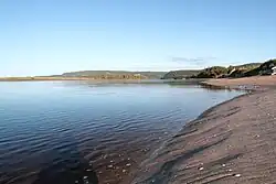 The indigenous Montagnais called the river Oiaouirabougou, or Oiauirabugu, meaning "whirlpool".[2] The name Godbout or Godebout is found in documents from the 17th century. There are two theories about the origin of the name. One is that it was named after François Godbout, caption of a Hudson's Bay Company schooner. It is more likely that the village of Godbout was named after Nicolas Godeboust (1634−1674), a navigator and pilot who was mentioned in the 1666 census, and the river was named after the village. A 1670 text by Père Albanel mentions the rivière Godebout, and a 1684 map by Jean-Baptiste-Louis Franquelin shows the place named Godebou.[5] The name was made official on 5 December 1968.[6]