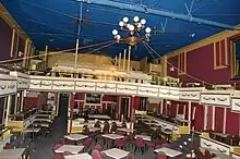 On 1 June 1962, a disastrous fire, caused by an electrical short, all but destroyed the superstructure of the auditorium, and caused severe damage to the entire structure.[13] The Goldenrod was then purchased by a group of St. Louis businessmen headed by Frank C. Pierson and Don Franz, and restored to her original glory, and beyond. Plush carpeting was laid in the auditorium, with cabaret seating, under a huge crystal chandelier. Many antique appointments were salvaged from old St. Louis mansions being torn down. Brass fixtures and rails were restored or replaced, as was the tin ceiling and elaborate woodwork. A cocktail lounge was added, with a small bandstand where the St. Louis Ragtimers band played traditional ragtime for many years. The upstairs staterooms were converted into a buffet dining room. When this $300,000 renovation was completed, Goldenrod had her Grand Re-Opening in May, 1965. In 1967, she was registered as a National Historic Landmark. Mr. Pierson also owned the Becky Thatcher, a former packet boat, traveling no more but moored beside Goldenrod, featuring a restaurant, lounges, and gift shop.
