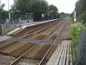 Gomshall Station has two staggered platforms. A gated foot crossing had been in use to access both until 25 November 2016 when it was replaced by a permanent bridge with ramped and stepped access.[3]