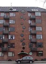 Built in 1935–36 to designs by Ib Lunding, the apartment building at Nr. 7-9 is in spite of its robust Functionalist style known as the Champaign House due to its irregularly placed windows of the staircase. It was heritage listed in 1997.[7]