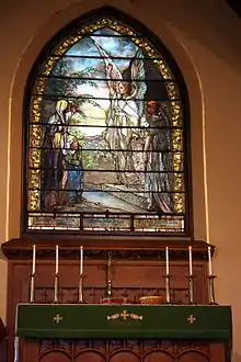 The building is characterized by several stained glass windows in Gothic framing, flanked by stone buttresses. The largest such window is on the northwest wall, but the chancel window at the southeast, entitled "Three Marys at the Tomb", was designed by Tiffany Studios.[3] It depicts the Virgin Mary, and Mary Magdalene at the tomb on Easter morning. The window cost $3000.[4]