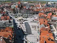 The Grand-Place (French: [ɡʁɑ̃ plas]; "Grand Square"[lower-alpha 1]) is the main square and the centre of activity of Tournai, Hainaut, Belgium. The square has a triangular shape, owing it to the convergence of several ancient paths,[2] and it covers 7,500 m2 (81,000 sq ft).