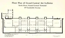 The board sought a location in Manhattan that was central and easily accessible. Through the support of Alfred Holland Smith, president of the New York Central Railroad, the top of the Grand Central Terminal was made available. The official street address was 15 Vanderbilt Avenue. The Painters and Sculptors Gallery Association signed a 10-year lease,[9] and together with the railroad company, invested more than $100,000 in preparations.[5] The Galleries extended over most of the terminal's sixth floor, 14,000 square feet (1,300 m2), and offered eight main exhibition rooms, a foyer gallery, and a reception area.[4] A total of 20 display rooms were to be created for what was intended to be "the largest sales gallery of art in the world."[5] The architect was Delano, best known for designing Yale Divinity School's Sterling Quadrangle.