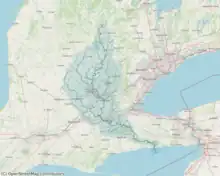 With a watershed area of 7,000 square kilometres (2,700 sq mi), the Grand River flows from Dundalk to Lake Erie with numerous tributaries flowing into it:[9]
