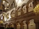 A small vestibule, open to the court by three arches, provides access to the prayer room with three wooden doors. This large rectangular room is divided into three parts: the central nave of the building height, and on each side the aisles, which are lower, separated from the nave by twelve columns recalling the twelve tribes of Israel. Each column is topped by a various Corinthian or composite styled capital. On each side, above the aisles as well as above the entrance hall, there is the gallery reserved for women with balustrades of stone columns.