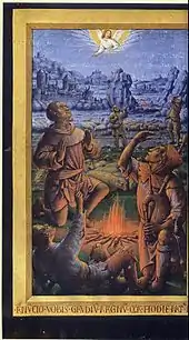 The book is large for a book of hours at 30.5 cm by 20 cm, and consists of 476 pages including 49 full-page miniatures, 12 calendar pages with genre scenes of the months of the year, two pages of Anne's heraldic devices, and 337 pages with illuminated borders showing flowers and other plants.[2] The full-page miniatures have large figures in an advanced Renaissance style for France at this date, drawing on both Italian and Flemish painting, and with well-developed perspective. There are gold highlights on the figures, a technique taken from Bourdichon's master Jean Fouquet, and the miniatures are framed with imitation gilded wood picture frames of the type found in Early Netherlandish painting, a style Bourdichon used in some other miniatures.[3][note 2] Similar frames surround the miniatures of the Sforza Hours, begun in Italy in the 1490s. Outside the frames the edges of these pages are painted plain black. Some landscape backgrounds suggest a knowledge of the sfumato style of Leonardo da Vinci.[4] In particular specific borrowings from the architecture of Bramante and the painting of Perugino suggest that Bourdichon may have made an unrecorded visit to Italy.[5]