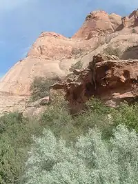 A trailhead which gives hiking access into the canyon is located directly adjacent to Utah State Route 128 (SR‑128).[1] The trailhead is located about three miles (4.8 km) east of the junction of SR‑128 and U.S. Route 191. The Morning Glory Natural Bridge[2] is located in the canyon[3] about 2.5 miles (4.0 km) from the trailhead and has a length of 943 feet (287 m).