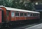 No. 695[33] 'Barnum' open brake third Awaiting restoration, which is planned to incorporate a kitchen where the brake end used to be, so it will complement the rest of the Barnum set. N/A. GCR Rolling Stock Trust. 1911