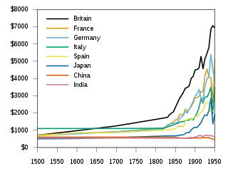 Maddison's estimates of GDP per capita at purchasing power parity in 1990 international dollars for selected European and Asian nations between 1500 and 1950,[1] showing the explosive growth of Western Europe and Japan in the 19th century.