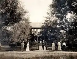 The plantation complex, in 1973, included a two-story main house. The house, then known as Cotton Place,[2] was enlarged and "Victorianized" in 1874–75 by railroad businessman William Morrill Wadley to retire there. The original house, built in the early 1800s, was plantation plain in style. Subsequent owners called it Colaparchee, before Wadley bought it in 1873. He named it "Great Hill" after his birthplace near Brentwood, New Hampshire.[2] The plantation, then 1,360 acres (5.5 km2), cost $6,410 (~$168,459 in 2022).[3] Wadley was buried beside the house, in the Wadley family cemetery, after his death in 1882. His wife, Rebecca, joined him in 1905.[4]