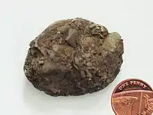 This Devonian conglomerate rests on the Birker Fell Andesite Formation, a thick sequence of andesite lava flows from the Ordovician Period, about 450 million years ago, and part of the Borrowdale Volcanic Group. This rock may be seen at the foot of the fell in the south-east corner, where a small quarry (at the beginning of the path along the south side of the fell) has extracted a little of this andesite.[7][8]