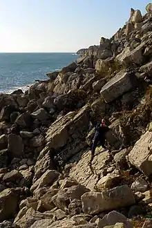 Since the landslip the area south of Church Ope Cove has been given the local name of Southwell Landslips. The cliff face has been subject to extensive quarrying, and subsequent smaller landslips have tilted huge masses of rocks at odd angles.