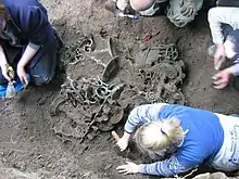In 2004, archaeological excavations were carried out on the site of The Great Synagogue.[3] About 400 objects were found during the works, comprising the equipment of the Synagogue – including chandeliers, copper Ner tamid lamps, fragments of furniture and ornaments, decorative floor tiles, marble elements of the Aron Kodesh, a ceremonial dish for washing hands, charred fragments of prayer books and commemorative plaques.[4] Most items date from the second half of the 19th century. The discovery was transferred to the Auschwitz Jewish Center in Oświęcim, where the artifacts were catalogued, inventoried and restored. Some items are on display at the permanent exhibition at the Center's Jewish Museum.[5]