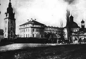 Historical photograph of the Great Weigh House, as seen from the Grodzka Street, with Town Hall Tower (left) and St. Adalbert (right)