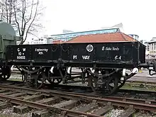 The operating department had a requirement for wagons to carry gas for carriage lighting. These were given the telegraphic code 'Cordon' and came in two distinct styles, with two long tanks along the length of the wagon (diagram DD5) or nine short tanks stacked across the wagon (DD4).[28] There were also match or 'shunting' trucks to connect broad and standard gauge wagons until the broad gauge was abandoned in 1892,[29] or to run with overhanging or dangerous loads.[30] These were originally just ordinary flat trucks run without a load, but in later years a number of old wagons were kept for this purpose and given diagrams L21 to L23. Cranes also had match trucks of various styles in diagrams L1 to L20.[30] Shunters' trucks were another kind of flat wagon and could be found in diagrams M1 to M5. These had full length footboards and handrails for shunters who rode on them during movements around or to and from stations and depots. These wagons carried a distinctive asymmetrical toolbox and usually had their depot name painted on this.[31]